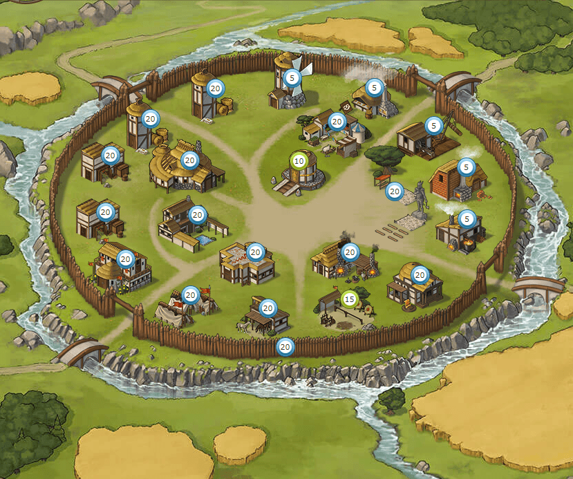 Players start with a single village but can expand their empire by founding or conquering additional villages. Each village can be developed by constructing various buildings, such as resource production sites, barracks, stables, and defensive structures. The placement and upgrading of buildings are critical decisions that impact the efficiency and security of the village.